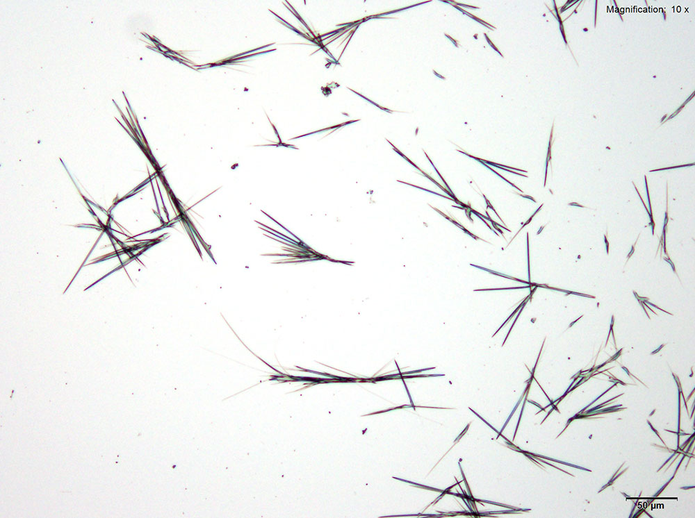 Mercuric chloride reagent gives long, flat and thin blades that may grow individually or in clusters. The colorless blades when oriented on their sides look like dark needles and appear dark. The blades appear white and bright under crossed polars.