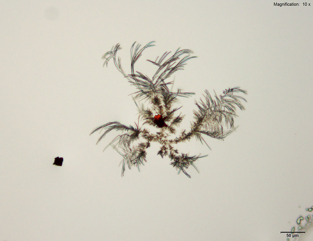 With gold bromide reagent, very small red rods are observed for 2C-B-FLY. These rods grow abundantly and the drop may appear to have precipitated immediately upon adding reagent. The wavy short rods are better visualized under higher magnifications.