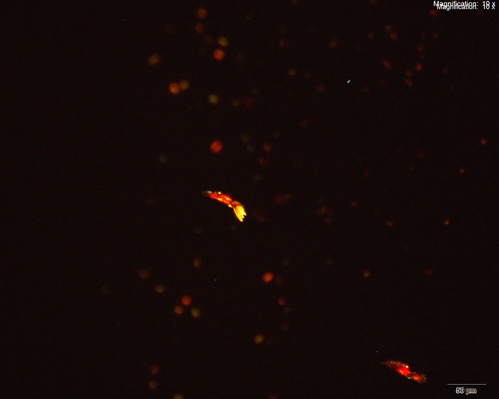 Methcathinone in the acidic gold bromide reagent gives small, orange x-shaped crosses that are better characterized under higher magnifications as shown in images 3 and 4 above. The crystals form abundantly with methcathinone amounts below 10 μg.
